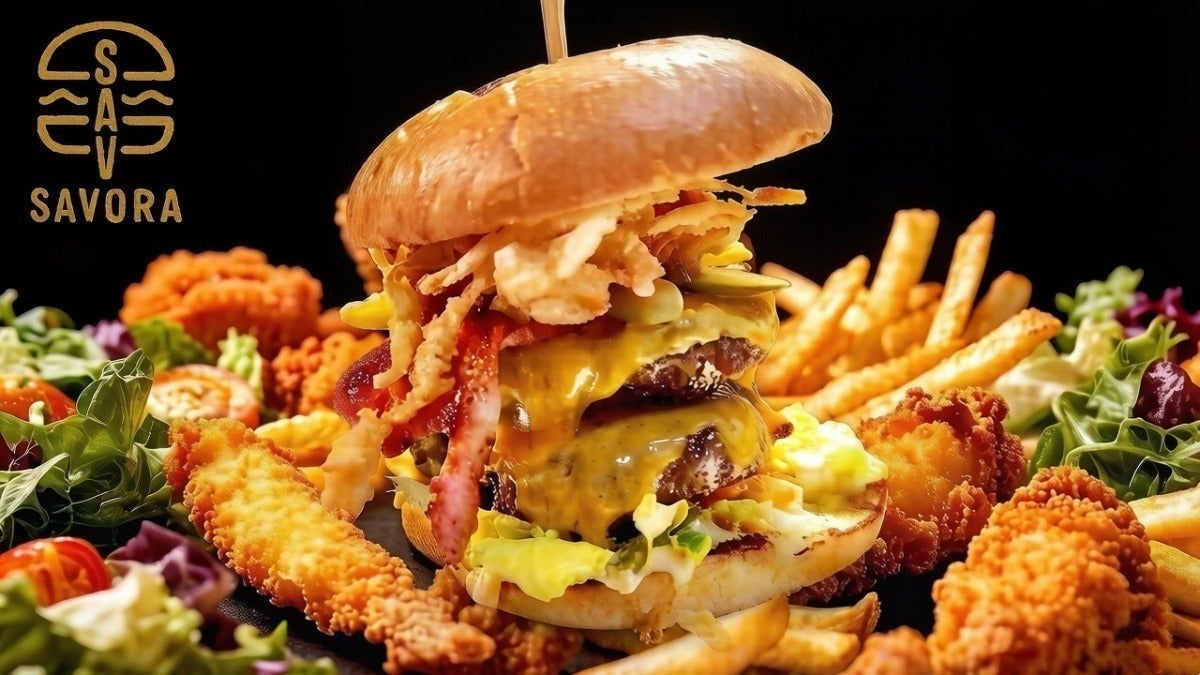 Grilled beef patties layered with melted cheese,fresh lettuce,pickeled red onions,crunchy fried onions,fried egg,bacon and homemade boom boom sauce€16.80Savora Titan