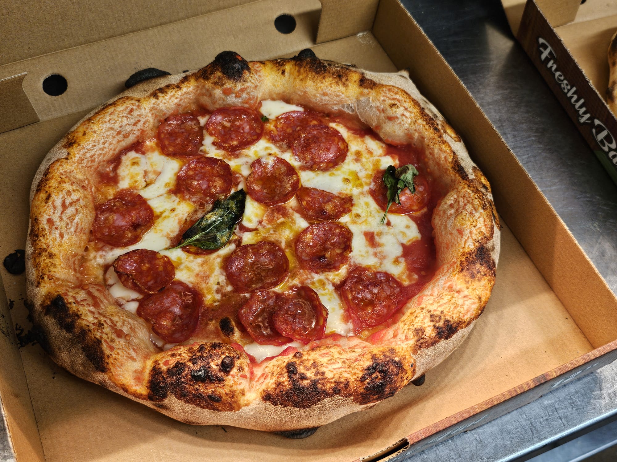 A timeless tribute to Neapolitan tradition. Our pizza begins with a rich San Marzano tomato sauce, renowned for its sweet and balanced flavor. Topped with creamy Fior di Latte mozzarella, fresh basil leaves, and a generous sprinkle of aged Parmigiano Reggiano. Finished with a drizzle of extra virgin olive oil to enhance its authentic taste.€14.00Pepperoni Classico