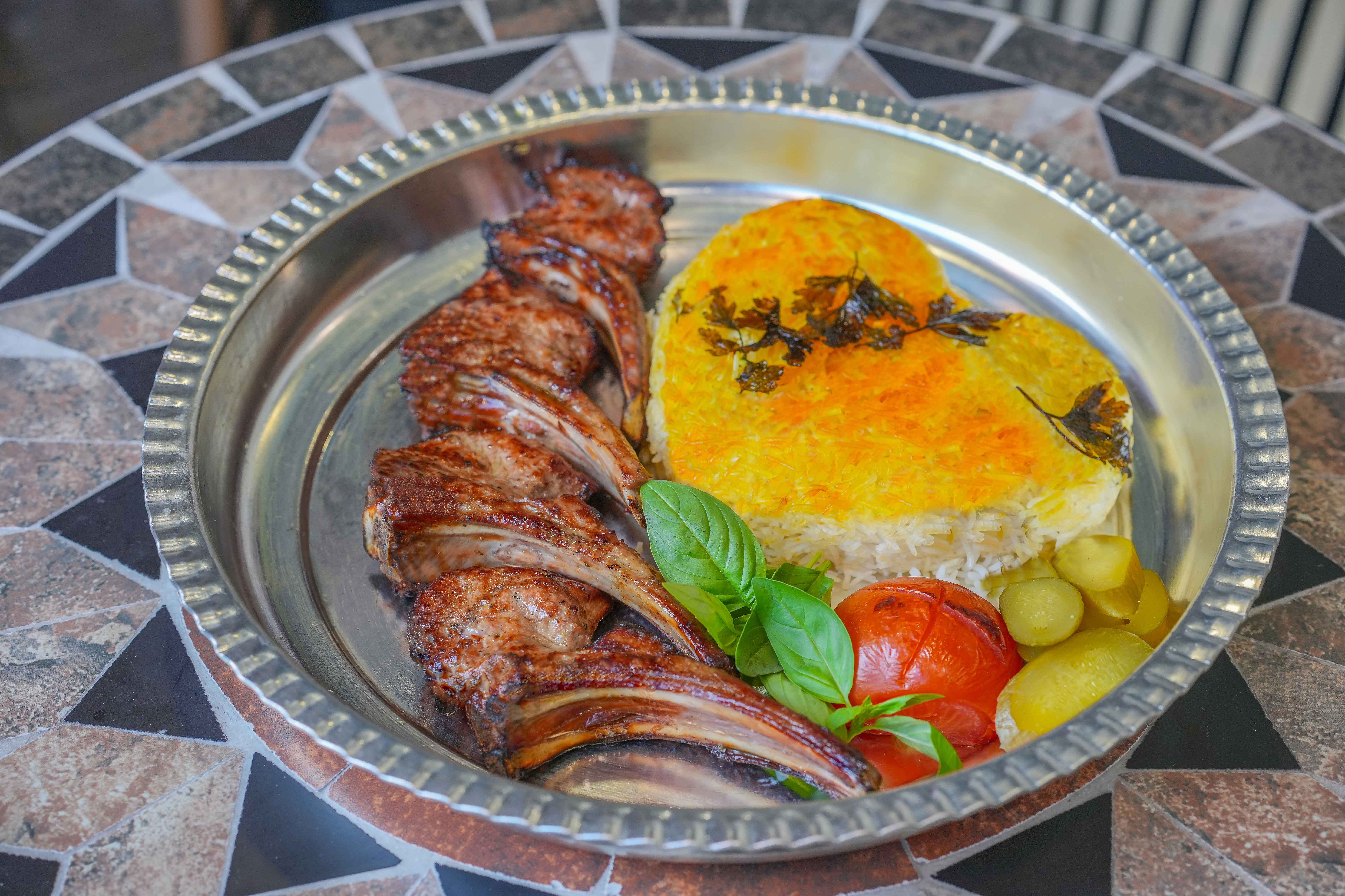 1 skewer koobideh (120 g) + 1 skewer Barg (220 g) = 340 g. Served with saffron rice, grilled tomato, pickled cucumber, fresh basil, lemon, and sumac.€23.00Chelo Kebab Barg (Lamb Lion)