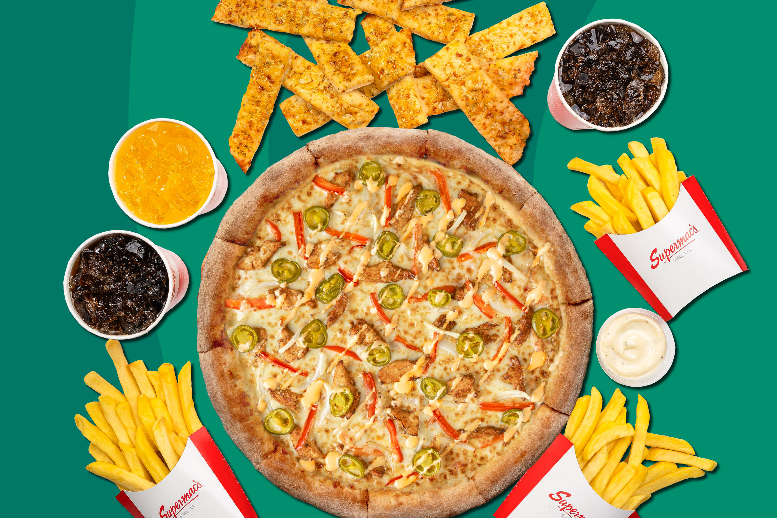 14” Pizza with 3 toppings, 3 Regular Drinks, 3 Regular Fries, 8 Chicken Nuggets or Garlic Bread.€32.95€50.303Double Deal - Small