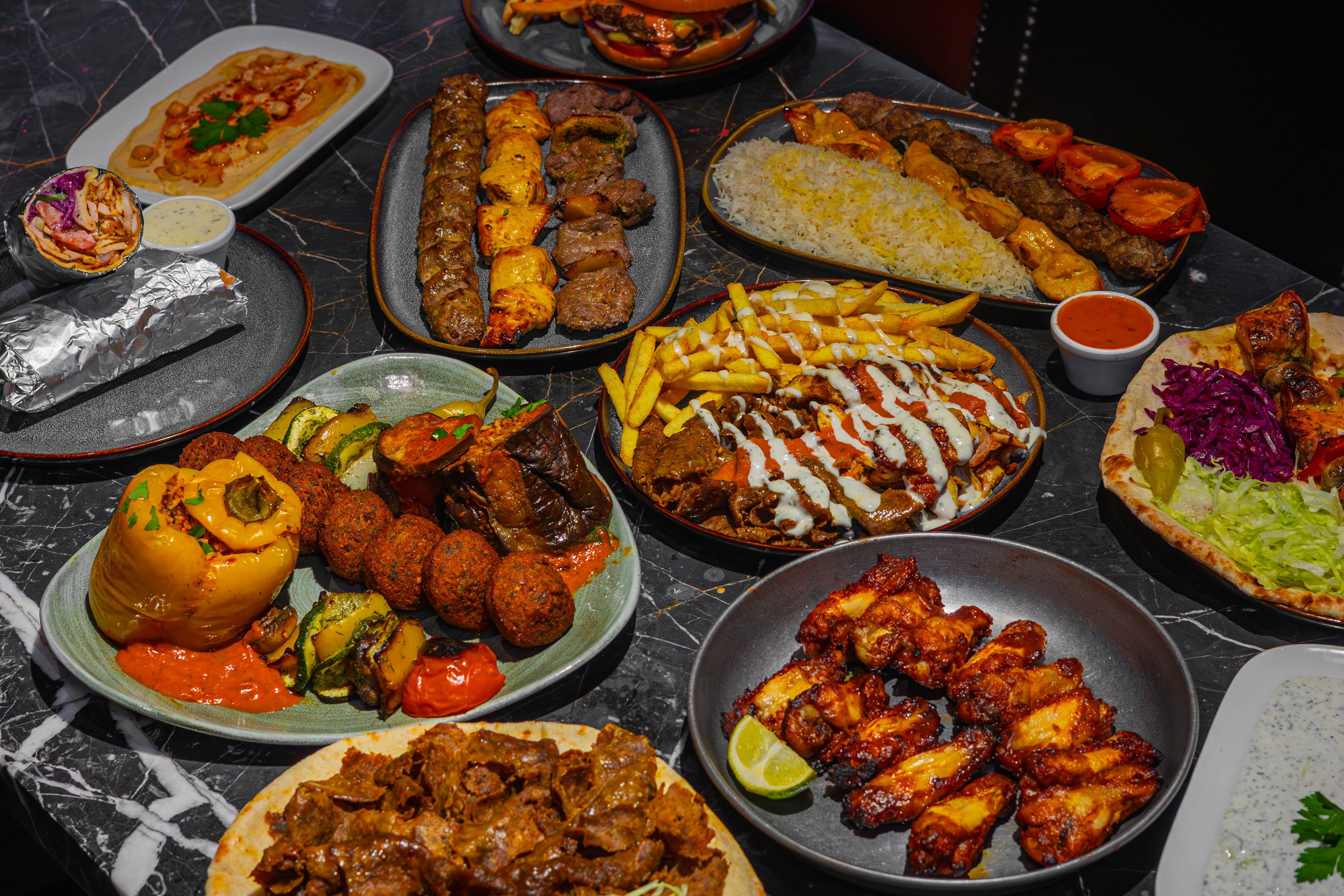 3 skewers (1 x beef shish, 1 x chicken shish, 1 x classic kubideh), 2 breads, salad, chilli & garlic sauces.Choose a side per person: Hummus or Tzatziki or Z Fries & soft drink.€46.002Vegetarian Platter